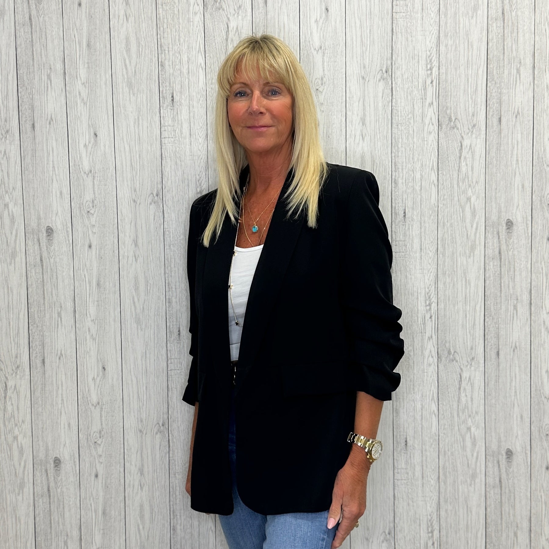This blazer is a must-have addition to your wardrobe. Featuring elegant lapels and ruched 3/4 length sleeves, it offers a polished look with two faux front pockets and a fully lined interior. Perfect for pairing with jeans and a t-shirt for a refined casual style or as a chic piece in your workwear or casual rotation.