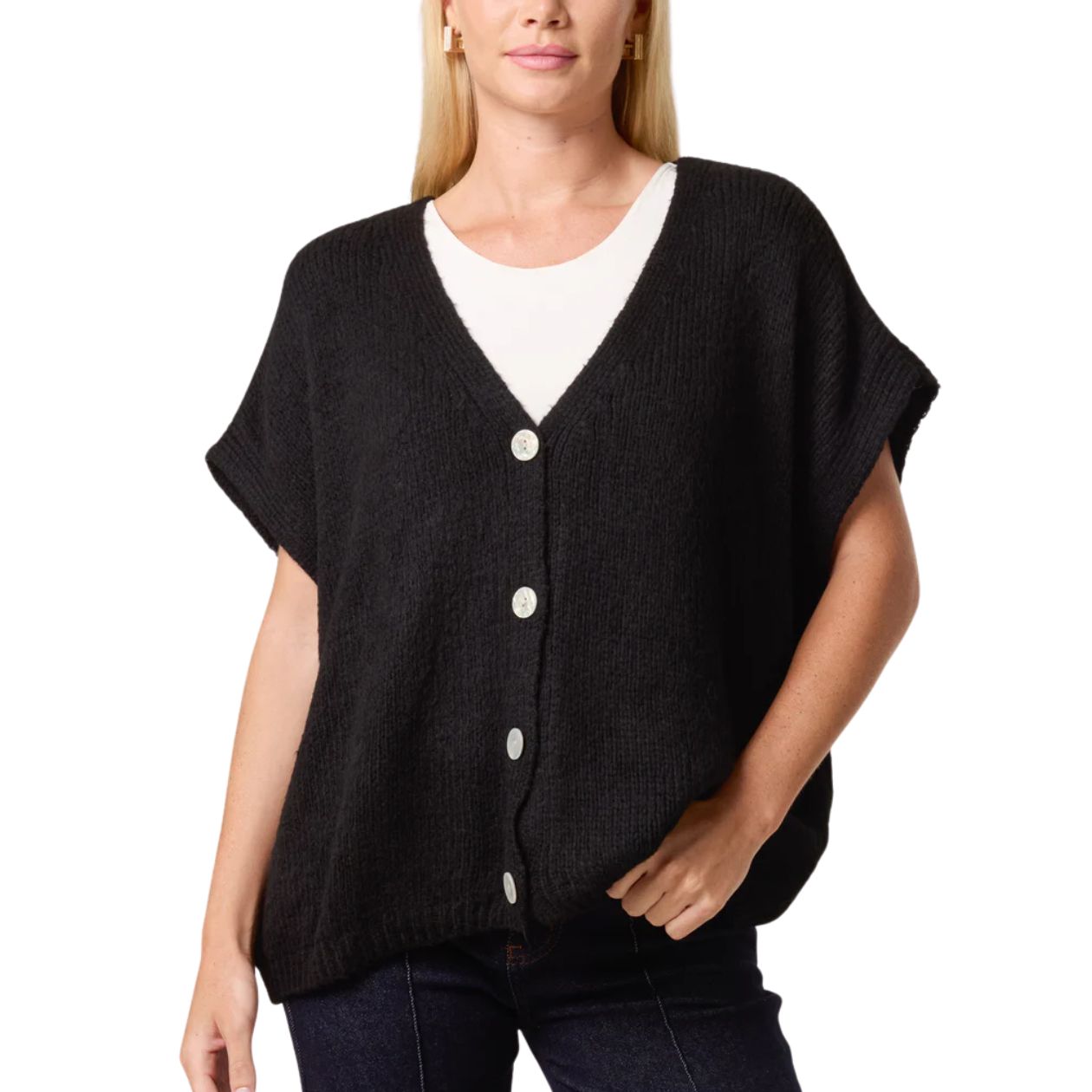 The Charlie Black Chunky Knit Sleeveless Cardigan combines effortless versatility with refined styling. Its sleeveless silhouette and flattering V-neckline make it an ideal layering piece for transitional seasons, while the chunky knit construction adds substantial texture and visual interest. Finished with pretty shell buttons, this cardigan transitions seamlessly from casual to polished looks. Whether worn over fitted tops or lightweight dresses, its neutral tone and structured design ensure it coordinates with virtually any wardrobe staple.