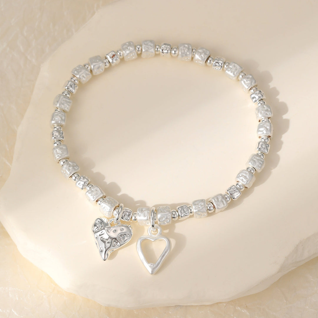 This Double Heart Charm Stretchy Bracelet in silver is the perfect gift for someone special. Featuring two charming heart pendants -one solid and one open - alongside elegant square beads, it combines style and sentiment beautifully. The stretchy design ensures a comfortable fit for any wrist, making it an effortless accessory to love and wear every day.