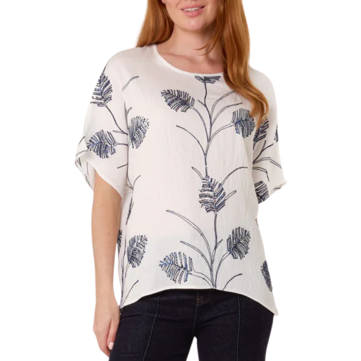 Elevate your everyday style with this charming Leaf White Sequin Cotton Blend Embroidery Top, with an enchanting navy leaf embroidery adorned with delicate sequins. The relaxed round neckline and short sleeves offer effortless comfort, while the longer back hem adds a modern twist to the classic silhouette. Perfect for layering or wearing solo, this fab piece brings a touch of botanical whimsy to your wardrobe.