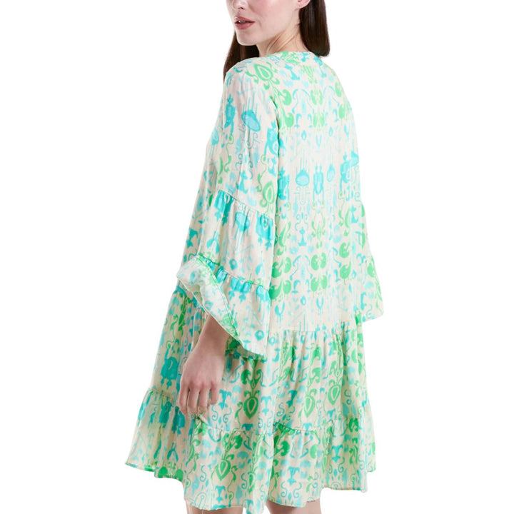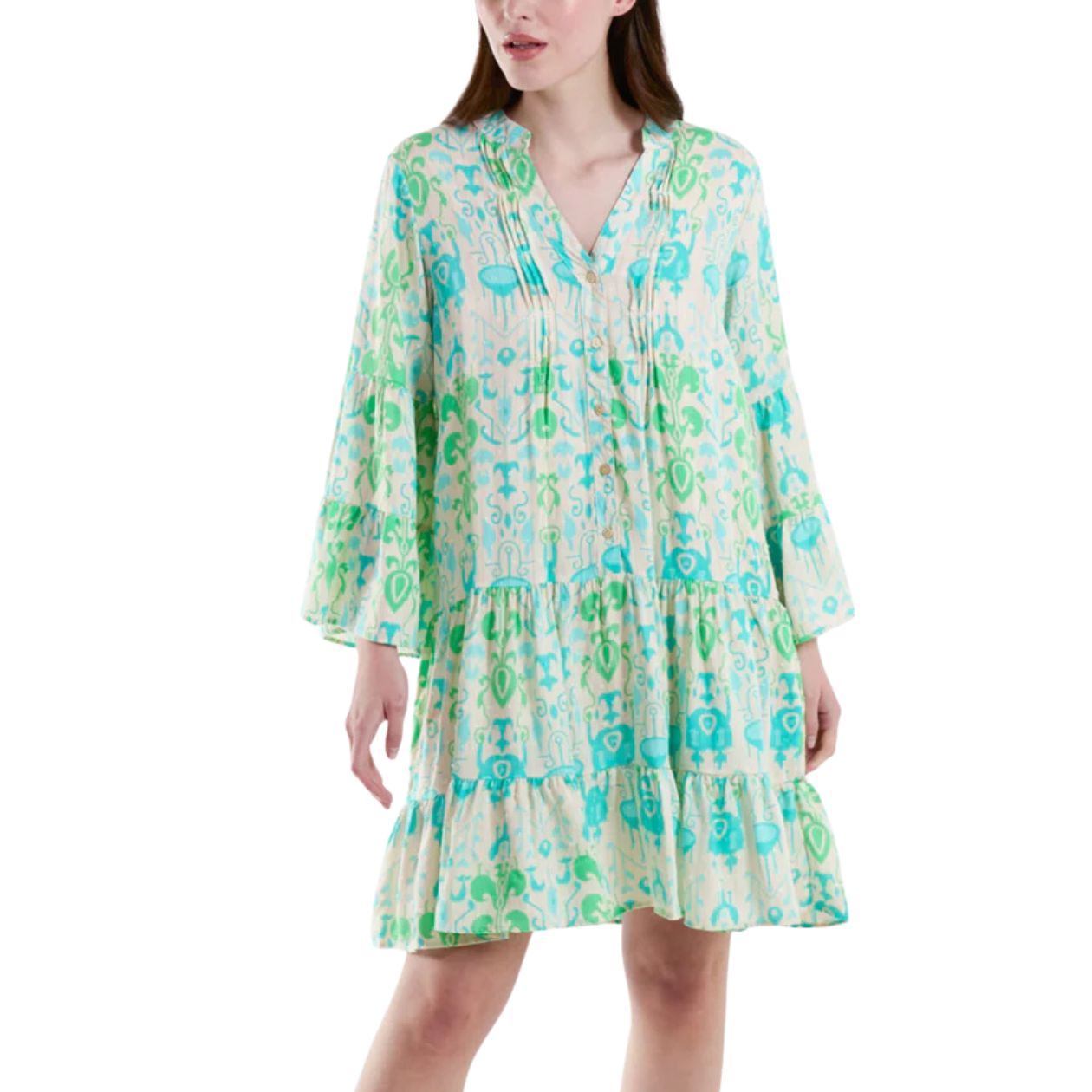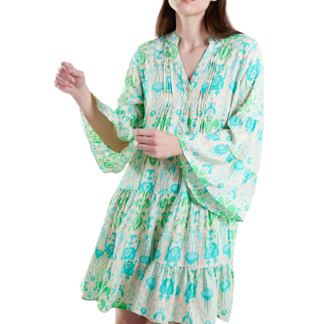 This charming tunic dress showcases an elegant baroque pattern that stands out with distinctive flair. Delicate pin tuck details adorn the front, complementing the feminine shape, while the bell sleeves add graceful movement. The open grandad collar completes this green and gold-threaded tunic with a touch of refined character.