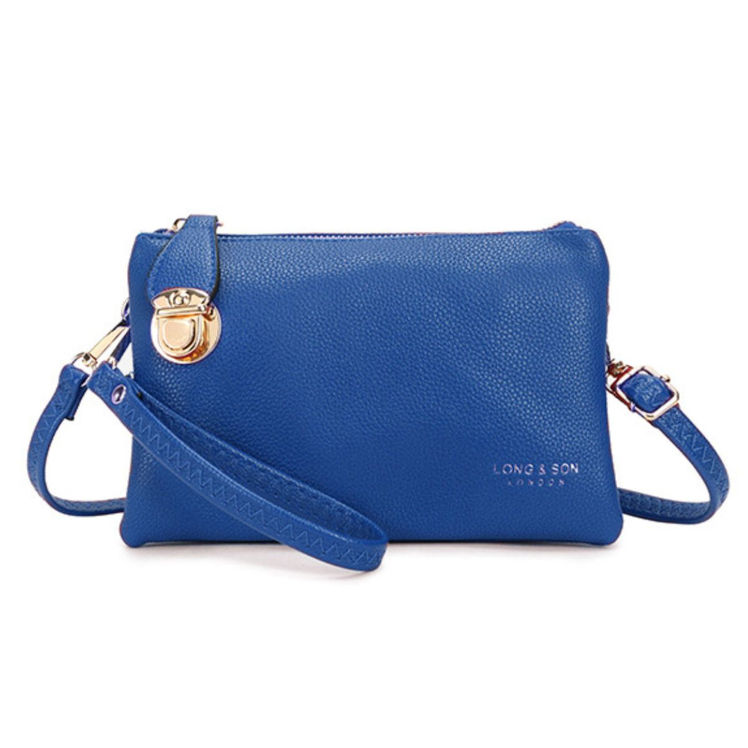 The Celia Clutch Handbag Faux Leather Royal Blue is a versatile bag designed for the modern woman. It has a sophisticated aesthetic with a sturdy metal clasp and zipper, four inner compartments, and a back zip pocket. Use it as a clutch or crossbody for all your essentials.