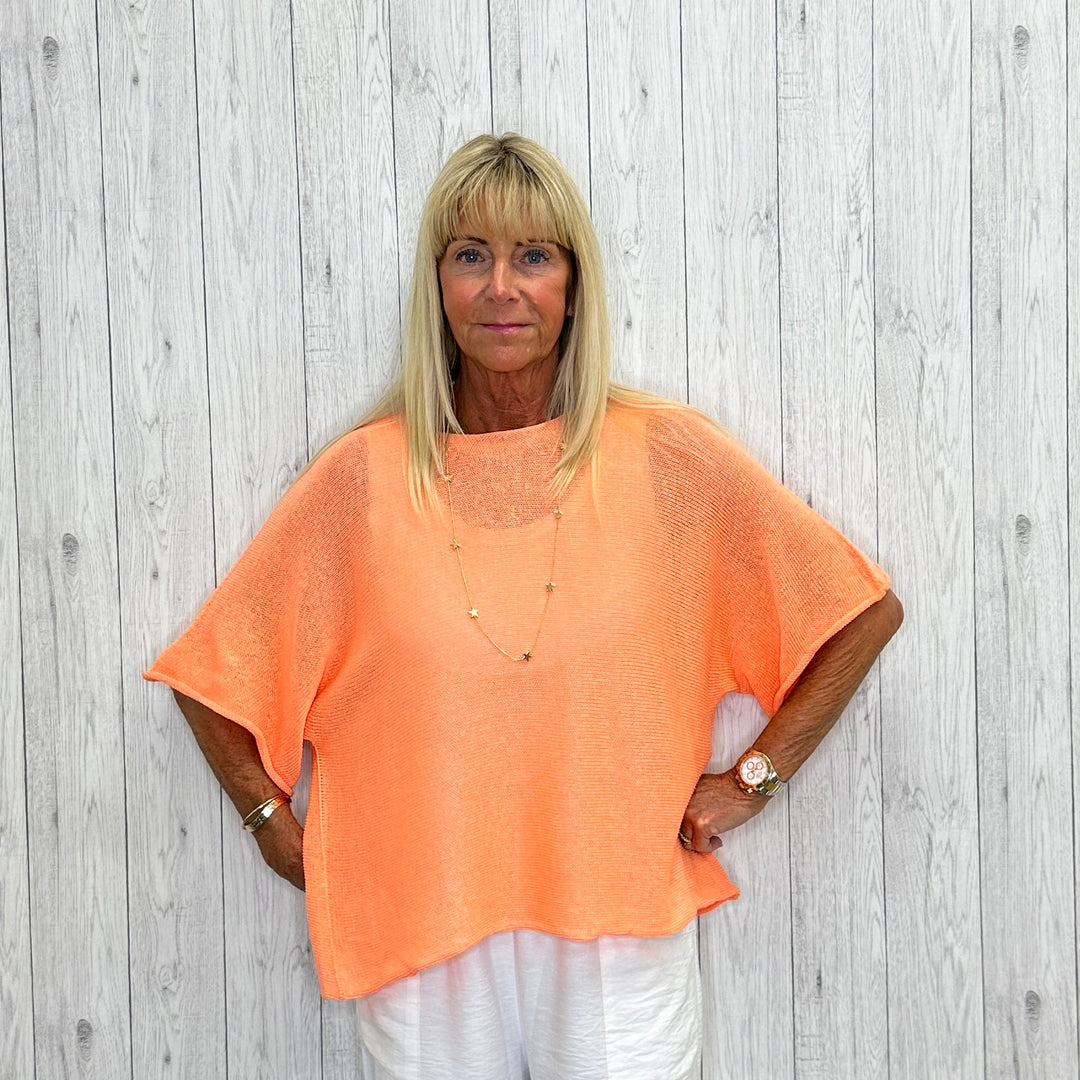 Crafted in Italy, the Chia Cotton Mix Lightweight Short Sleeve Jumper in Coral boasts a delicate knit and a stylish boat neckline that adds a touch of charm. Its short sleeves keep you breezy and effortlessly trendy all day long.
