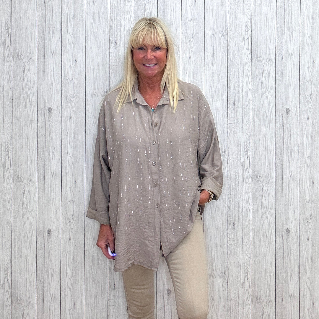Enhance your wardrobe with the Debbie Tie Front Silver Stud Shirt Full Buttons Mocha Brown featuring silver studs for a subtle yet glamorous look. The tie front design adds versatility while the full button closure and turned up sleeves with a button offer convenience and style. The longer back provides extra coverage for a polished silhouette.