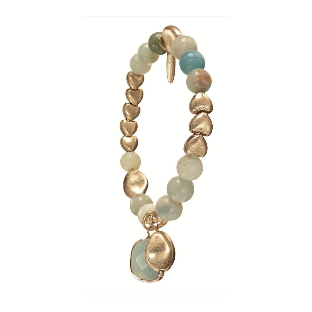 Pretty stretch Heart To Heart Bracelet with stone beads in pastel greens and marble creams interspersed with worn gold chevron hearts. There is also a matching stone pendant drop and bean shaped charm hanging from the bracelet. Perfect for adding a touch of elegance to any outfit.