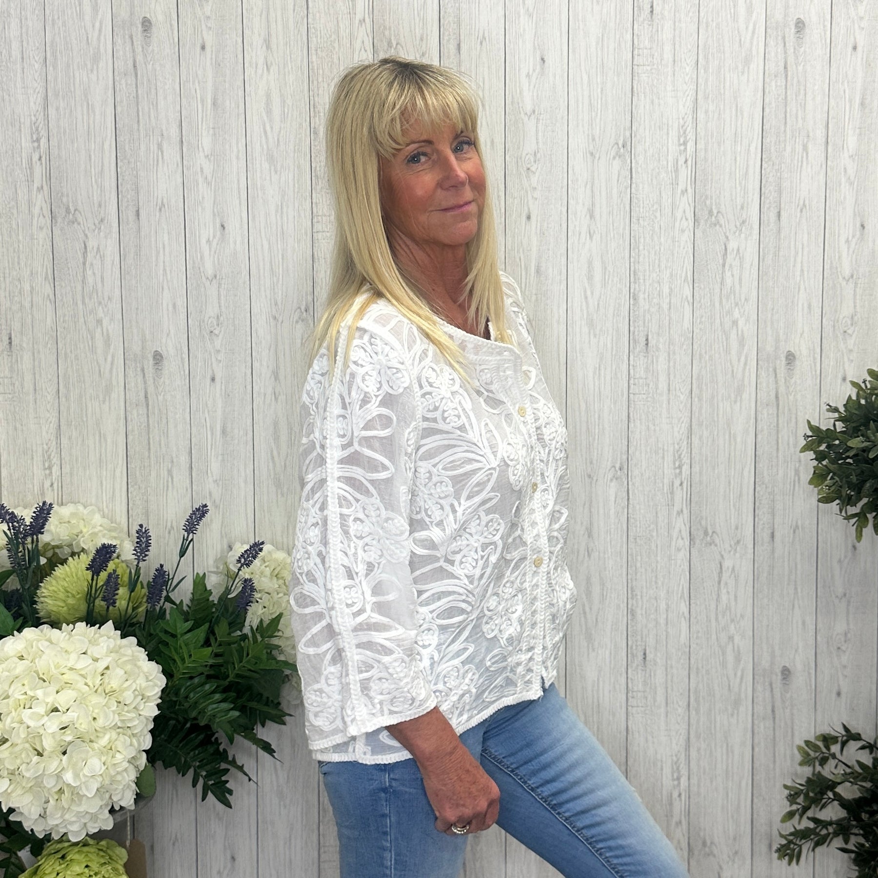 Add a touch of elegance to your wardrobe with our Louise Cotton Crochet Embroidered Cardigan in white. The super pretty cardigan features a loose round neck, tiny wooden buttons, and a slightly longer back for a flattering fit. The delicate embroidered design adds a pop of detail, making it the perfect piece to dress up or down.