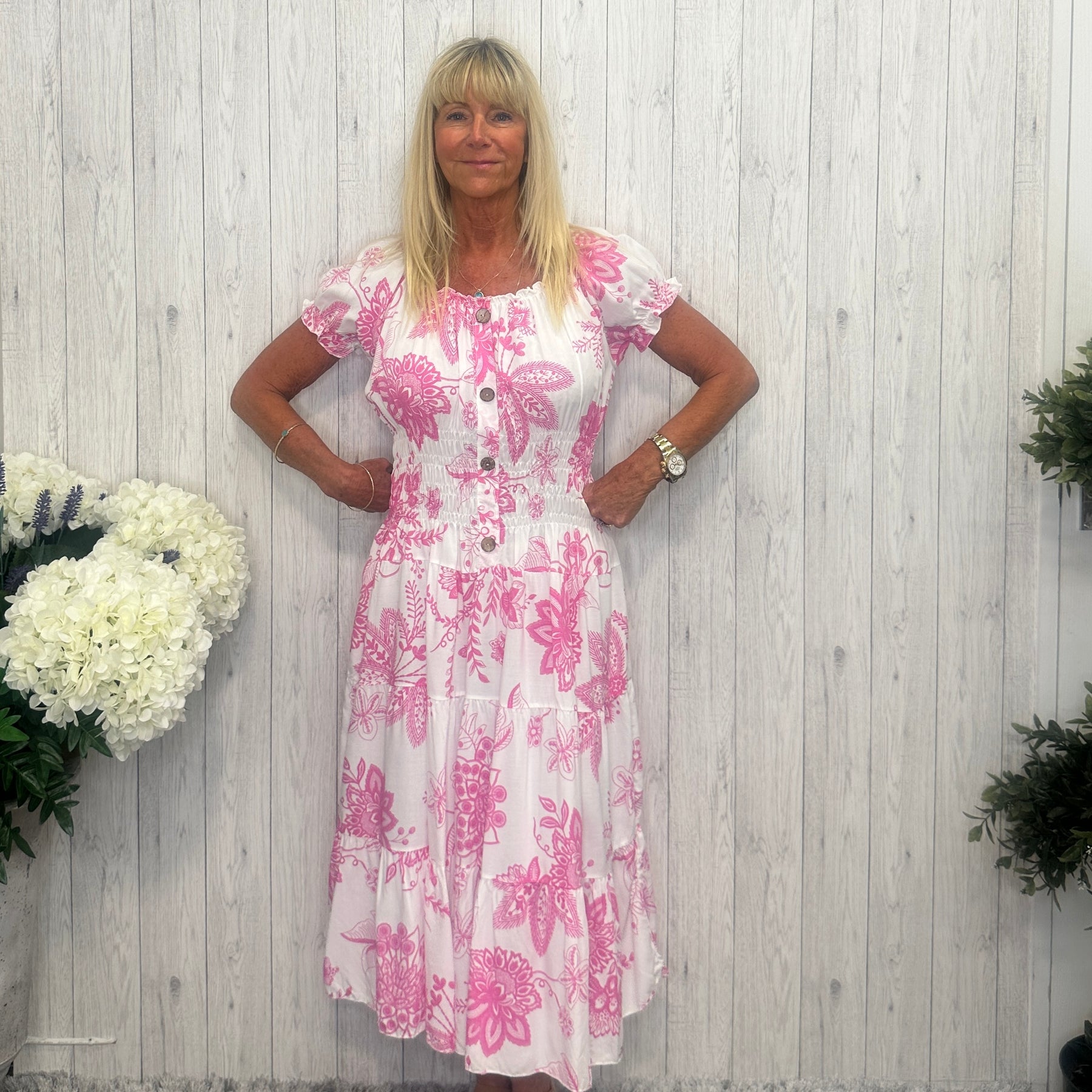 Step into summer with our delightful Aurelia 2 Maxi Dress in Bubblegum Pink! Adorned with a charming pattern, this dress features adorable puff sleeves and tiered layers that flatter your figure beautifully. The stretchy waistband hugs in all the right places, while the versatile neckline lets you switch between classic or off-shoulder styles for those fun bardot vibes. It's the perfect companion for all your sunny day escapades!