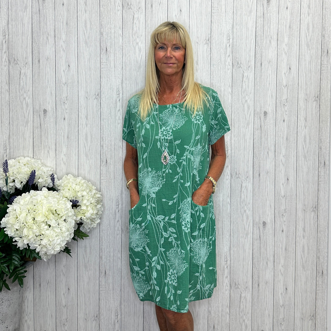 Made In Italy Dandelion Print Cotton Midi Dress Green