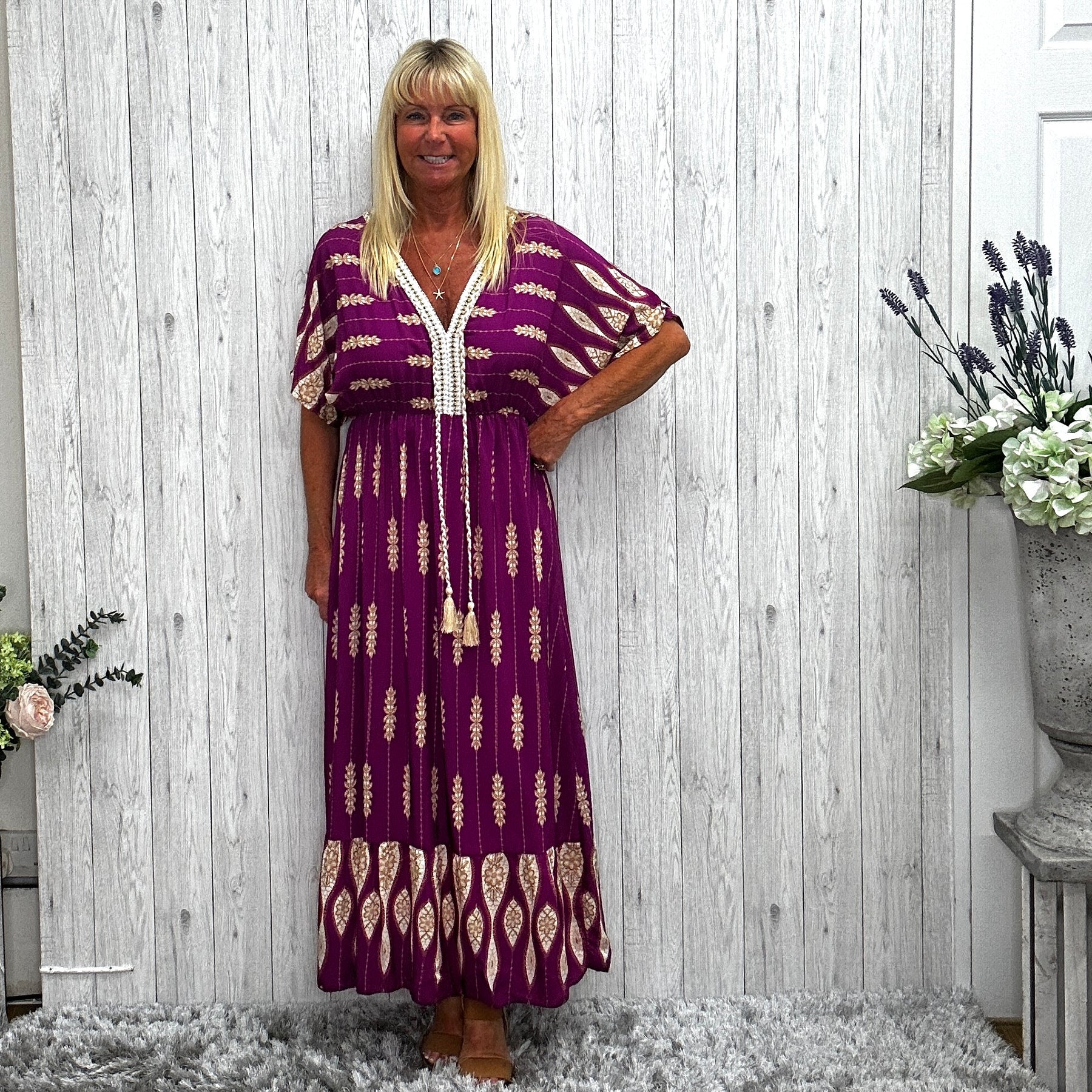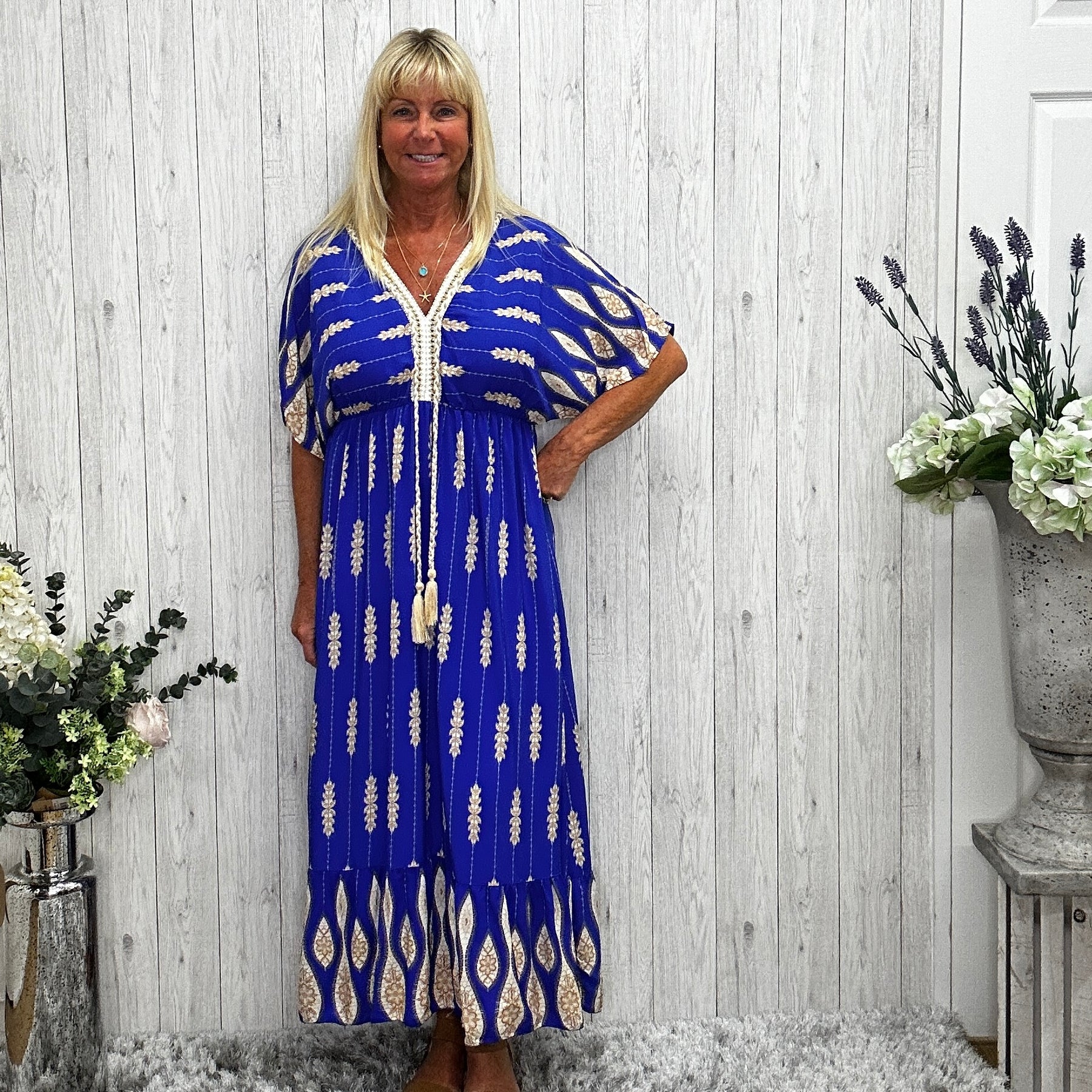 The Maeva Boho Maxi Dress is the perfect statement piece for a special occasion or everyday wear. Crafted from lightweight material, the dress features a pretty pattern, braided tassel accents, contrasting gold glitter neckline & tasseled sleeves for a playful yet sophisticated look. The elasticated waist & frill bottom provide a flattering fit that will keep you comfortable all day.