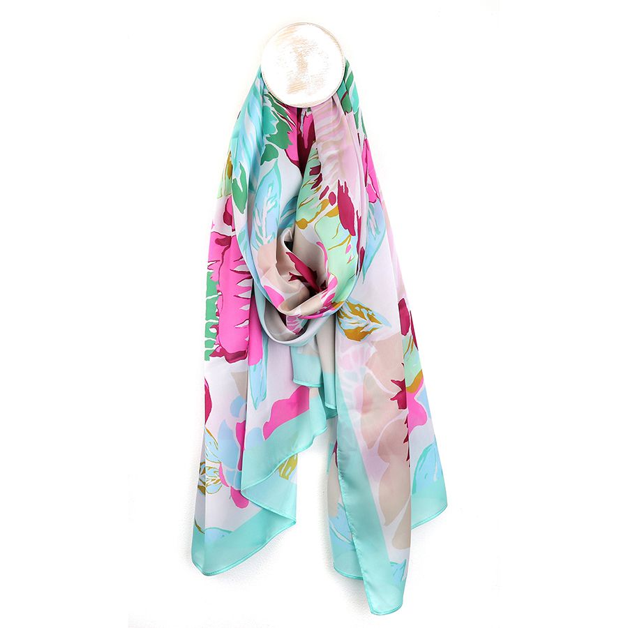 POM Silky Tropical Flower Print Scarf Aqua Blue