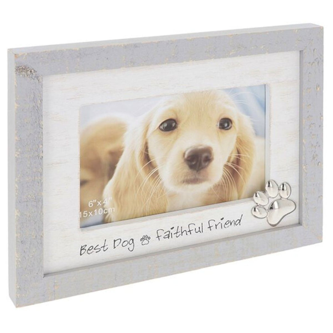 Check out our Rustic Sentiment Frame for your precious dog! The grey and white frame features the phrase "Best Dog and Faithful friend" with a darling little silver paw print.
