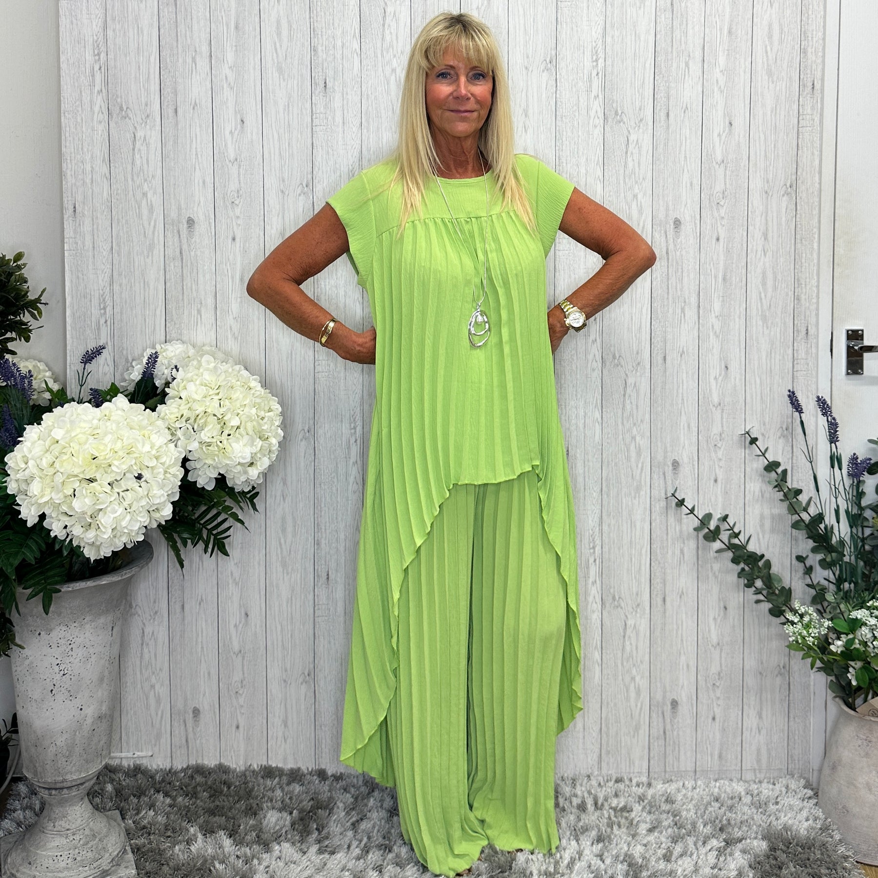 Elevate your wardrobe with our stunning lime green Sasha top. The beautiful pleated design creates a flattering silhouette, complemented by the sophisticated hi-lo hemline that offers extra length at the back. The thoughtful cap sleeves provide comfortable coverage while maintaining an elegant look. Whether you're attending a daytime gathering or evening celebration, this versatile piece transitions seamlessly between occasions, making it a wonderful addition to your special event collection.